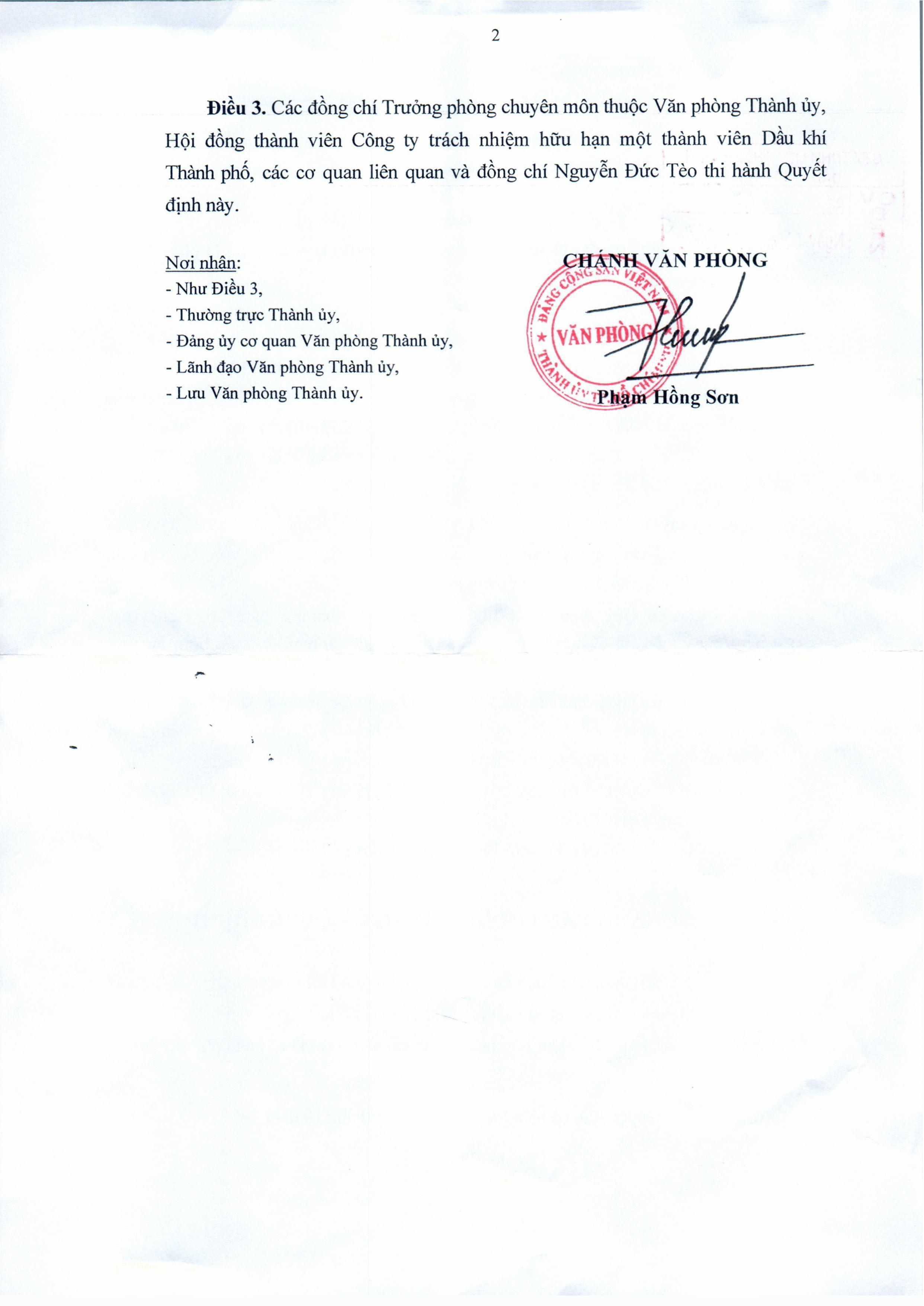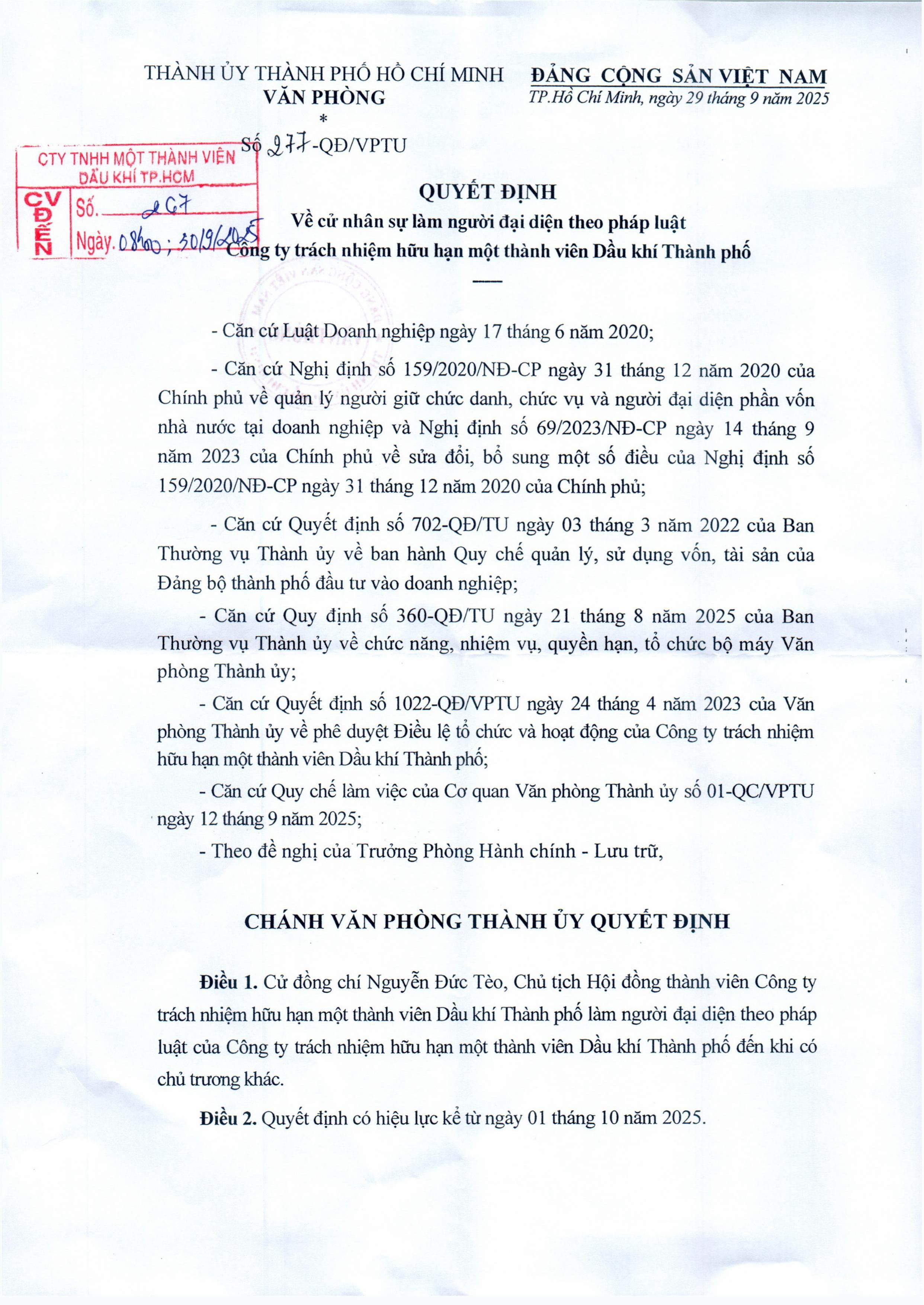 Quyết định về cử nhân sự làm người đại diện theo pháp luật Công ty trách nhiệm hữu hạn một thành viên Dầu khí Thành phố